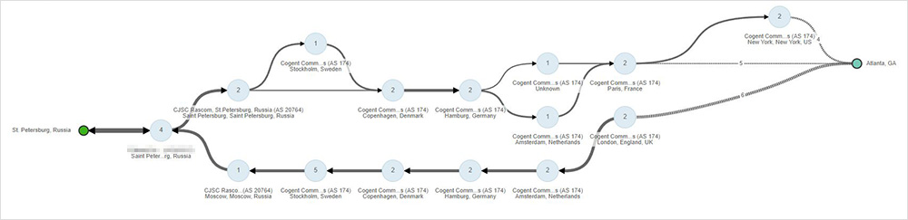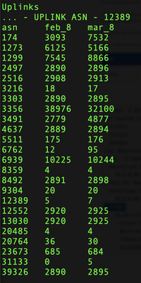 Level 3 (Lumen) is another transit provider that currently exchanges traffic with major Russian ISPs at locations outside the country—just as they have historically. Figure 5 (asn 3356, row 8) also shows Level 3’s uplink frequency for JSC Rostelecom, which though they slightly decreased over the past four weeks, shows their baseline in February at nearly 10x over Cogent, continuing to be the most frequently occurring uplink provider for this Russian ISP.