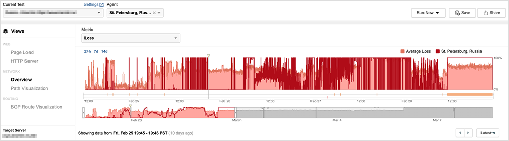 Looking at the availability of Russian sites belonging to government entities and energy, mining, and banking companies, we see that most have experienced substantially reduced availability subsequent to the invasion of Ukraine on February 23, 2022. For example, the website belonging to a government entity exhibited what appears to be normal behavior (nominal packet loss and normal server availability) from global locations prior to February 25, 2022. Then, starting around 23:30 UTC on February 25th, ThousandEyes observed a significant increase in packet loss connecting to the site, which impacted web server reachability.