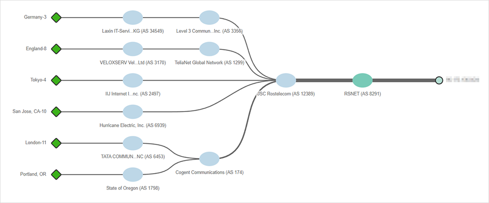 Between February 25th and March 1st, network conditions appeared erratic, with varying levels of high packet loss, followed by periods of 100% packet loss for either all users or only traffic originating outside of Russia—possibly due to source IP or network based filtering. Beginning in March, the site has largely been available only to some users in Russia (while some traffic originating in Russia is also blocked).Looking at the network path, we see that all packet loss is occurring at the service provider for the government entity website. This could indicate that packets are being dropped due to route-based filters that are designed to blackhole traffic (see figure 7).