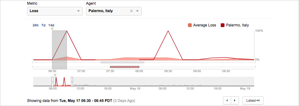 Beginning at 6:34 AM Pacific on May 17th, several ThousandEyes Cloud Agents in Europe (Palermo and Bucharest) started displaying severe packet loss. Before the issue started, both these agents were transiting the TISparkle network through Bucharest and Paris before exiting Europe to reach the Netflix service that was being monitored in Dubai. Feel free to follow along by using our shared link to the Netflix test.
