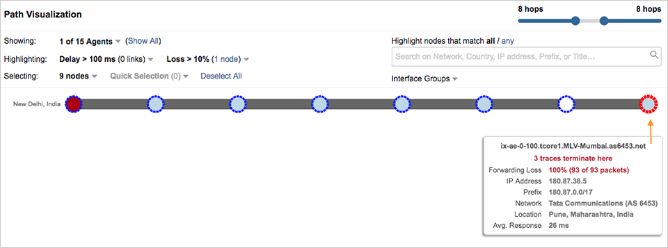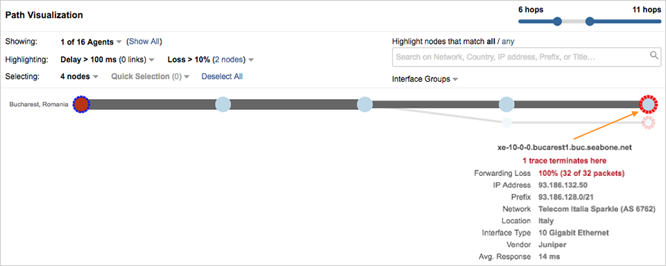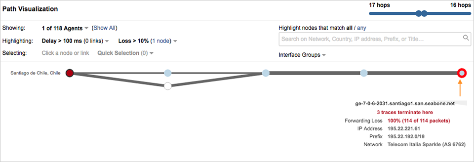 To narrow down where exactly the loss was seen, we used Path Visualization that showed 100% packet loss at the TISparkle node in Bucharest, shown in Figure 2.