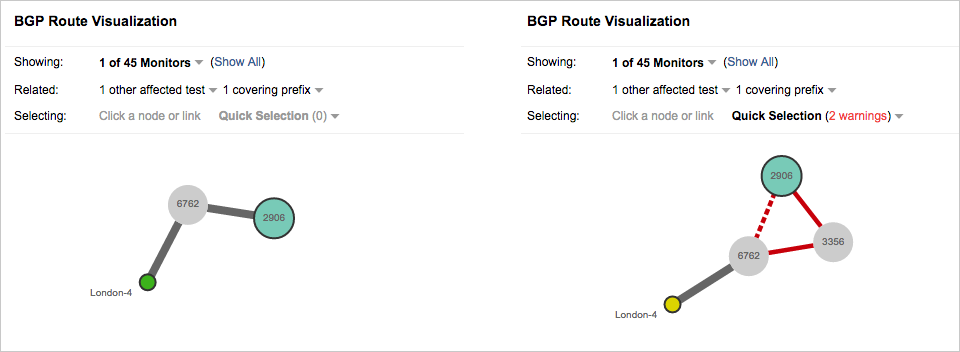 For the next couple of hours we observed intermittent connectivity accompanied by fluctuating packet loss from these agents. For a brief period we noticed that packets were being rerouted via TeliaNet and Level 3 and then again via TISparkle and Level 3. Interestingly, packets were being routed through the TISparkle Frankfurt PoP instead of the Paris PoP and exiting Europe through Level 3. BGP Visualization aligns well here, showing direct routes for the Netflix prefixes through TISparkle being withdrawn and peering with Level 3 to reach TISparkle.