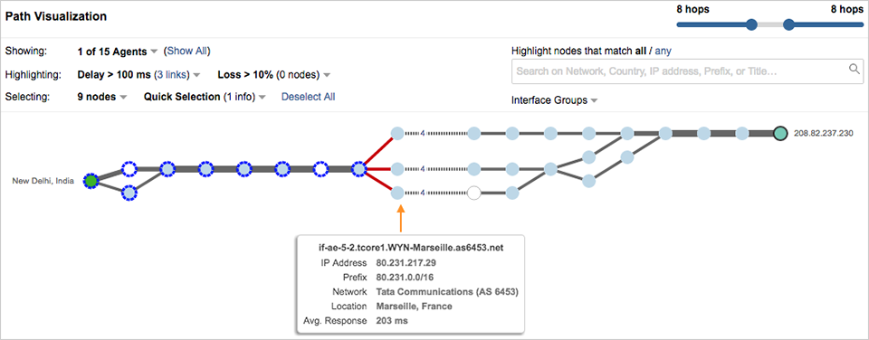 We went back a few time slices ahead of the problem to identify how the original path looked like and, not surprisingly, the next hop after the Mumbai node was the SMW-4 Europe egress location at Marseilles. The highlighted nodes in Path Visualization seen in Figure 4 above and Figure 5 below shows the unchanged part of the network. The high latency seen between the Mumbai and Marseilles node is also an indication that it is a transcontinental link.