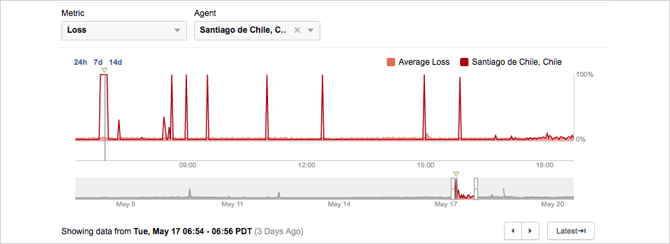 At the same time agents in Europe were seeing issues, Cloud Agents in Santiago, Chile and Cordoba, Argentina started experiencing 100% packet loss at a the local TISparkle PoP.
