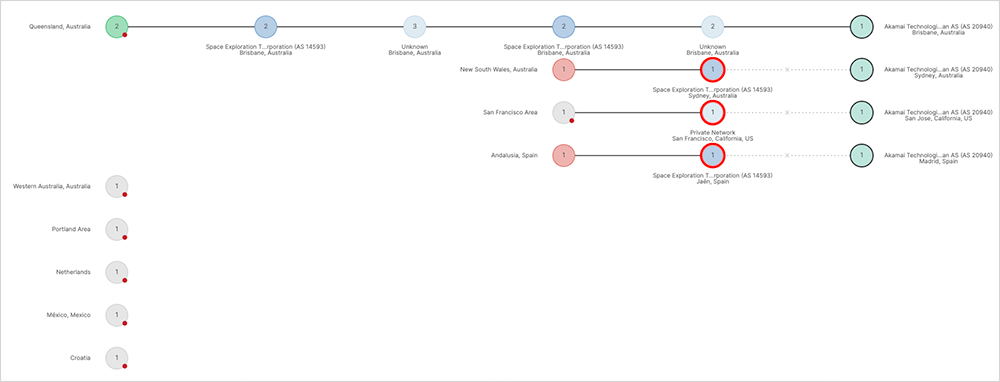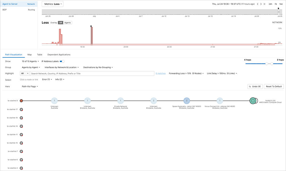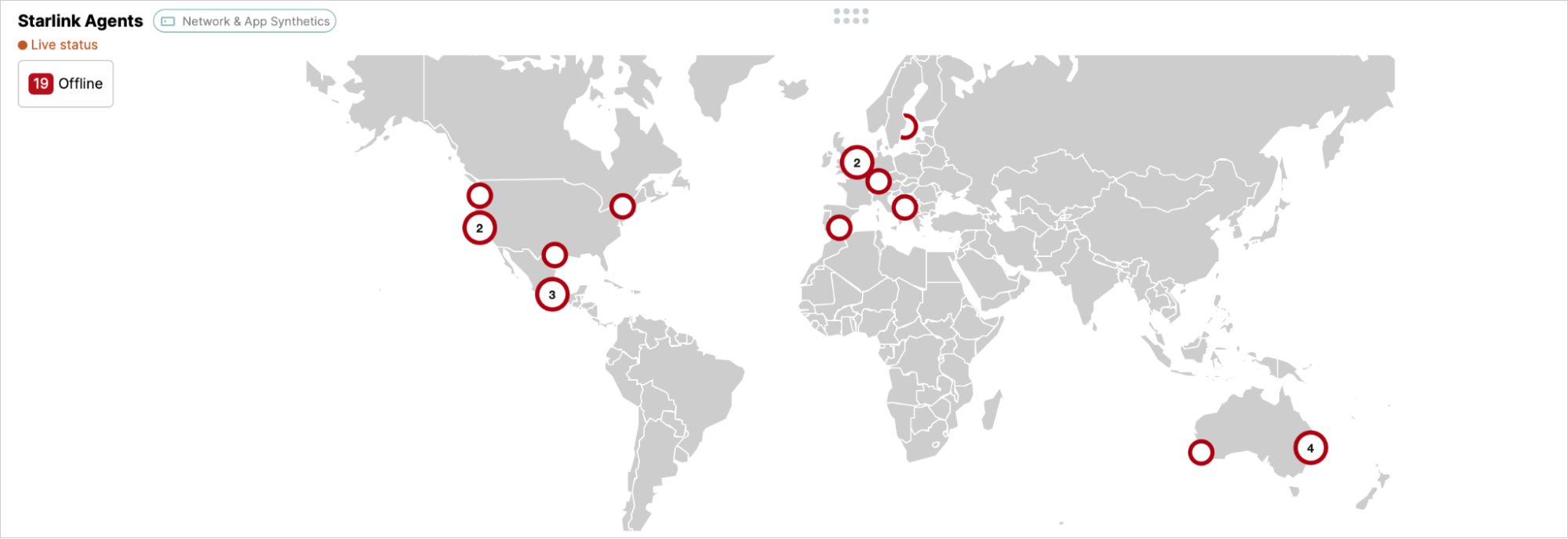 ThousandEyes monitoring observed unusual failure patterns during the Starlink outage, which suggested a system-wide issue rather than failures originating out of specific locations within Starlink’s network.