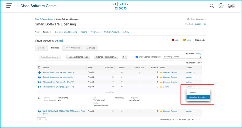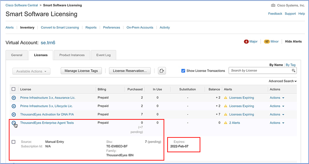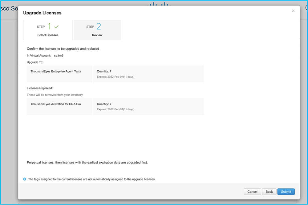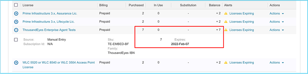 The submission automatically triggers the provisioning call to ThousandEyes. Afterward, you will be able to see the DNA licenses in your account being used for the ThousandEyes entitlement.