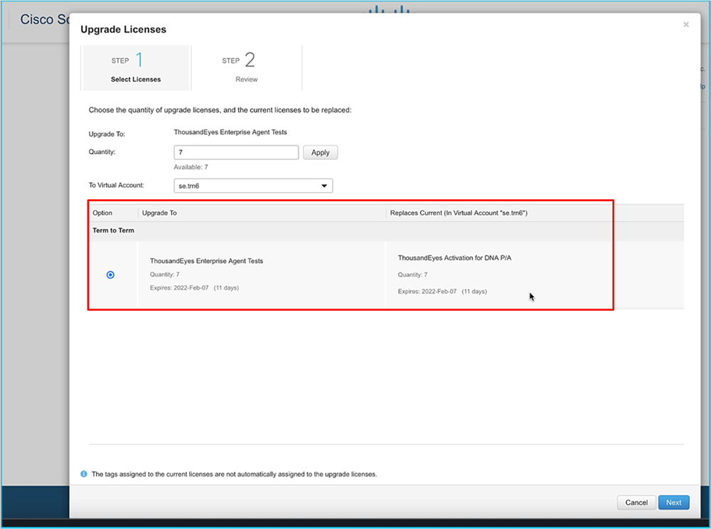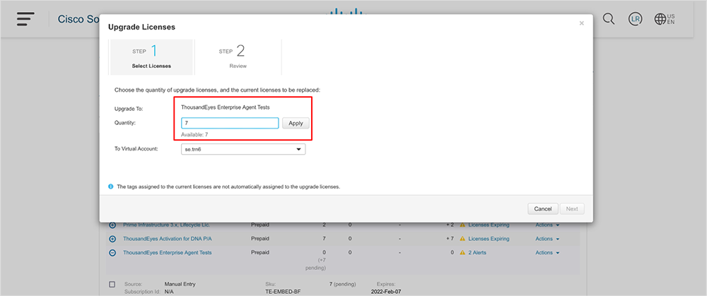 In this step, we need to select the quantity of DNA licenses we want to leverage for ThousandEyes activation. The most common use case is to select the whole quantity available.
