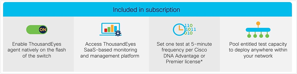 Please see this guide for more information about the free Cisco ThousandEyes entitlements that come with your Cisco Catalyst 9300 or 9400 Series Cisco DNA Advantage subscription.