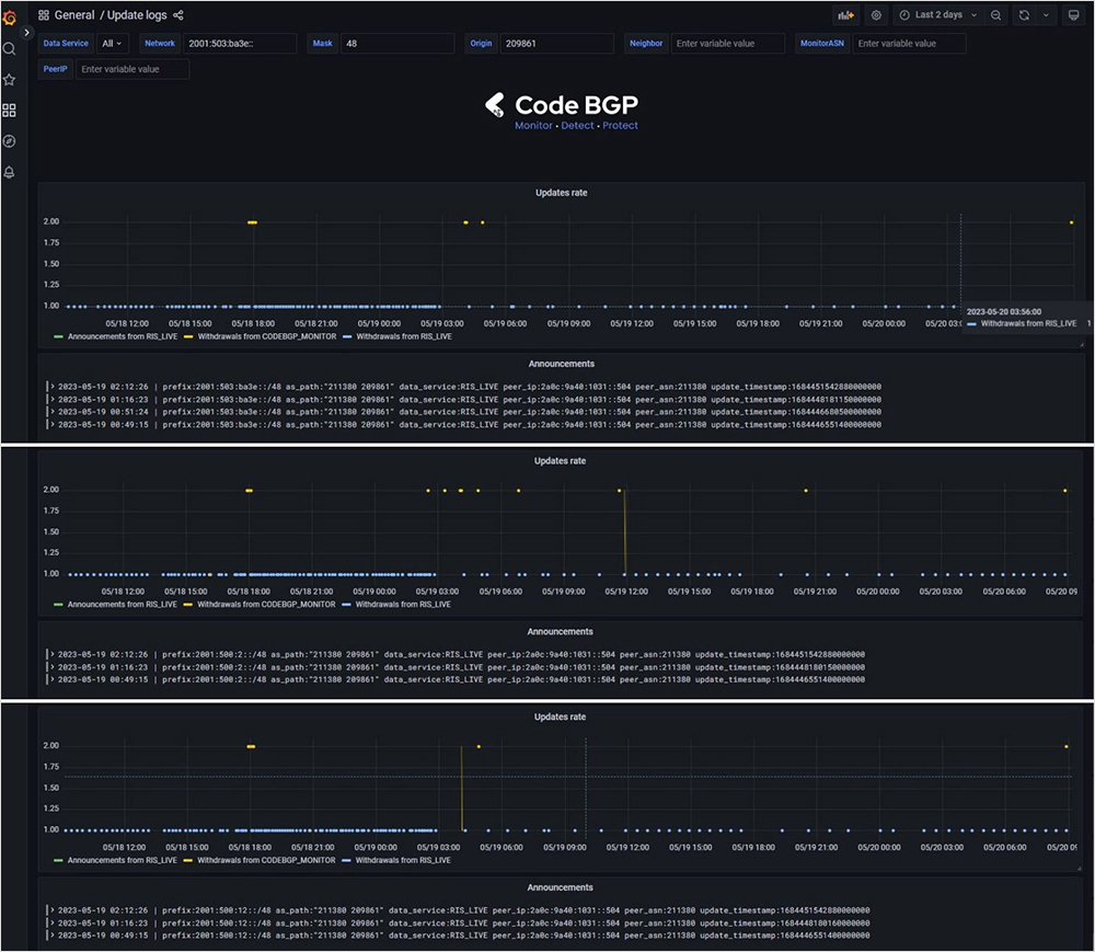 Contrary to the Code BGP Platform, which receives and processes all incoming streaming BGP updates from multiple sources, a monitoring platform that samples the BGP state every 15 minutes, for example, is incapable of detecting such ephemeral events.