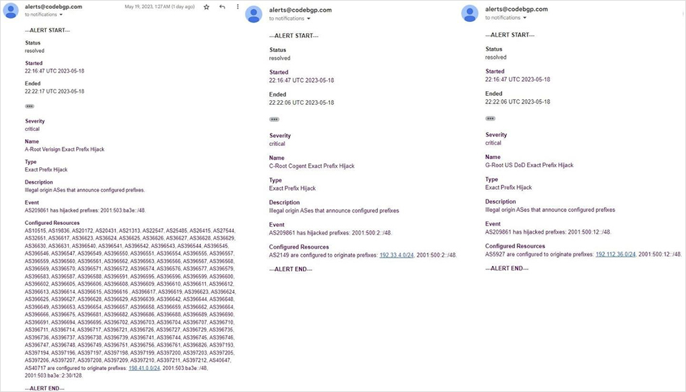 The Code BGP Platform identified that AS 209861 announced three prefixes belonging to Verisign, Cogent, and the US Department of Defense. These serve as the IPv6 prefixes for the A-Root, C-Root, and G-Root domain servers, respectively, three among the thirteen authoritative name servers for the DNS root zone.