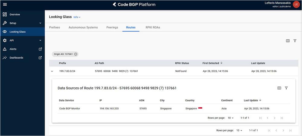 The logic behind the Code BGP platform’s data presentation, is that under each resource, we provide a sub-table with the sources which contribute information for the given resource, accompanied with geolocation information. In this case, the resource is prefix 199.7.83.0/24 and it’s suspicious route, and the source is one of the Code BGP Monitor routers located in Singapore.