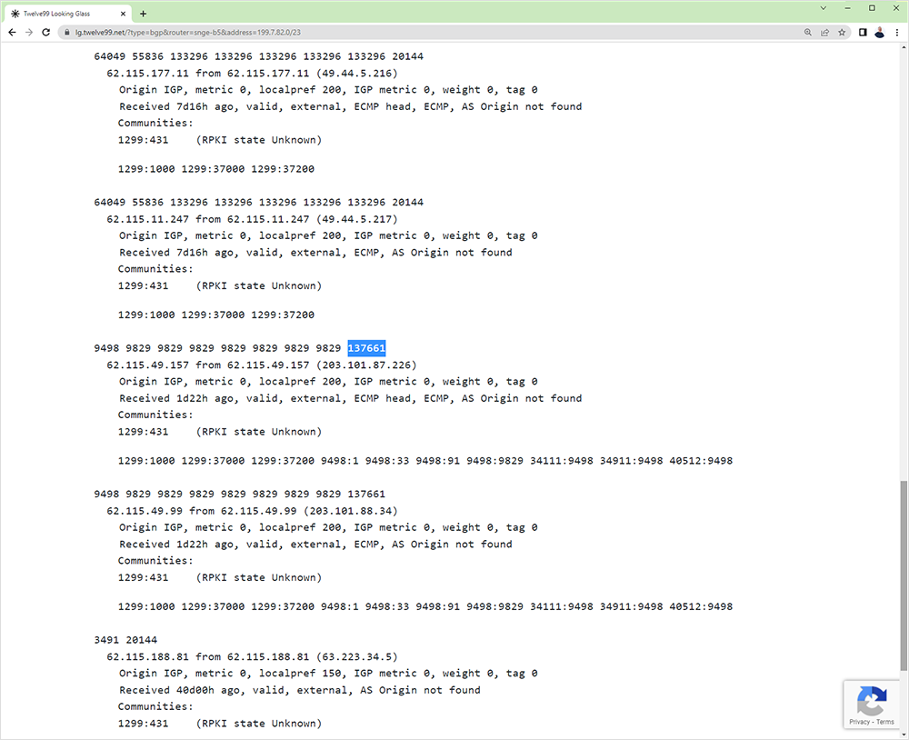 As our friend Migwei Zhang pointed out, the super-prefix 199.7.82.0/23 belongs to ICANN and is also being announced by AS137661! This announcement has very limited visibility too (due to the very long AS Path) but is being picked up by Arelion’s Looking Glass, HE’s BGP toolkit and bgp.tools.