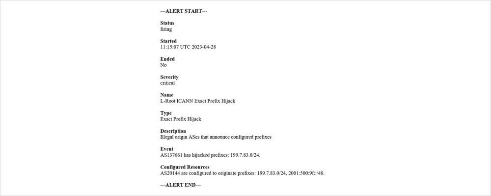 The Code BGP Platform has detected that AS137661 is announcing prefix 199.7.83.0/24, which belongs to ICANN and serves as the IPv4 prefix of the “L-Root” domain server, one of the 13 authoritative name servers for the DNS root zone.