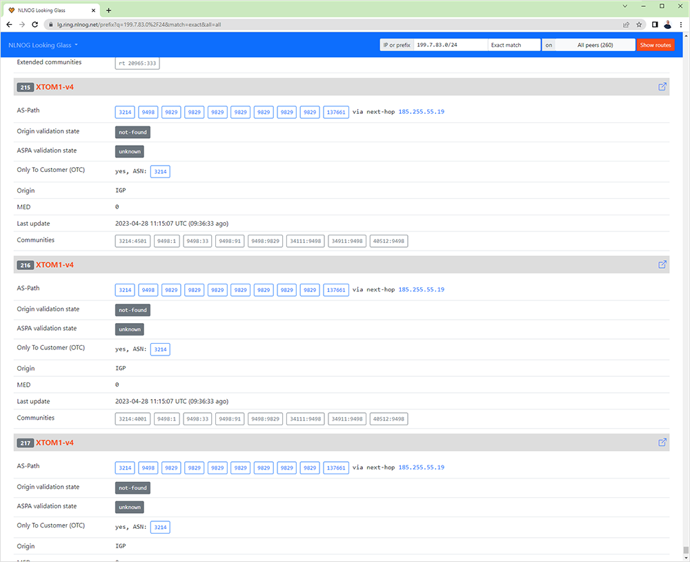 The route’s low visibility can be explained due to the very long AS Path (11 hops, including 7 prepends of AS 9829). Interestingly, the route is currently not visible by RIS Live, which is one of the data services of the Code BGP Platform. However, the route has been picked up by only three (3) servers which contribute data to the NLNOG Ring’s Looking Glass.