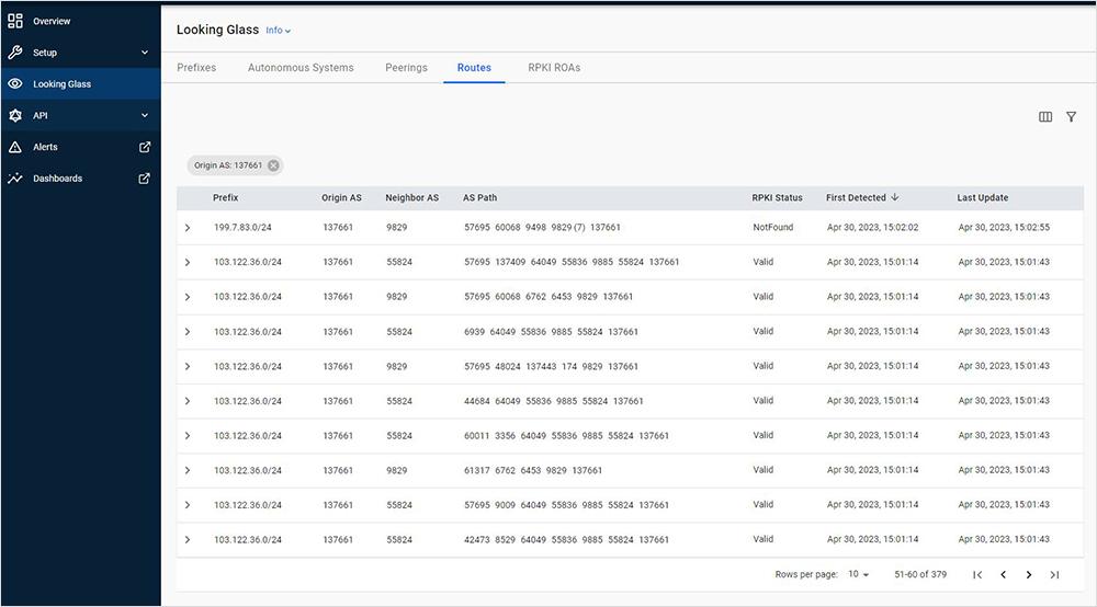 In the screenshot from the Code BGP Platform’s Looking Glass, we can see the prefix, Origin AS, Neighbor AS, AS path, RPKI status, and two timestamps which are automatically adjusted by the web browser to the user’s time zone (in this case UTC +3). The “Last Update” field contains the timestamp of the actual BGP update, whereas the “First Detected” field contains the timestamp of the update when it was stored in the Code BGP Platform’s database. These two timestamps are identical, indicating a sub-second delay between the time we receive an update and when we store it in the database – an engineering goal for the Code BGP Platform since its inception two years ago. As shown in the previous screenshot of the email alert, we received the alert one second later, demonstrating the speed of the Code BGP platform in detecting suspicious routing events.