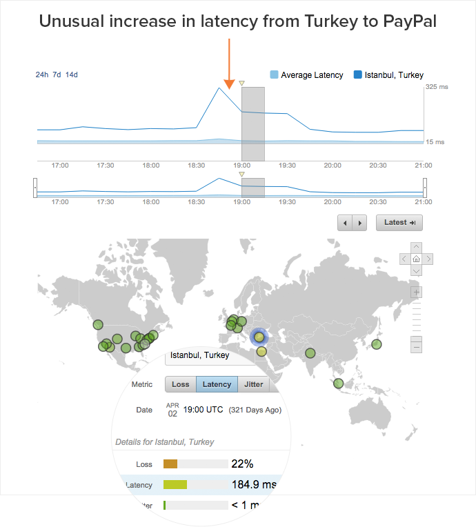 Dissecting a Social Network Outage. Time to dig into a recent network outage using historical performance data captured from our public cloud agents deployed across the Internet. We used ThousandEyes to look at a world view of connectivity to Facebook and observed a couple of locations in Asia having issues reaching Facebook in the connection phase. We then jumped to the ThousandEyes Path Visualization, which presents a topological view of the Internet. We used it to immediately identify the hop and node in the regional site covering traffic to Asia affecting the application experience. Now that we’d identified the cause, we showed how with ThousandEyes, it’s easy to share a snapshot of what you’re seeing or an interactive link to Facebook to expedite resolution of the issue.