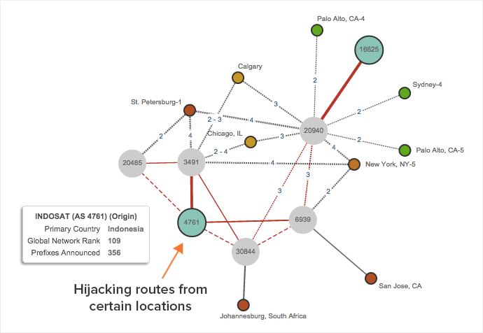 Digging Deeper - Routing and Hijacks. Another live dissection was for a large global manufacturer’s website. We looked a level deeper than previous examples at the control plane, searching for anything funky going on in the routing layer. We identified a BGP route that was flapping between two service providers, but for one of them, packets were being lost. From there, it was a few simple steps to identify the exact portion of the Internet causing the outage.