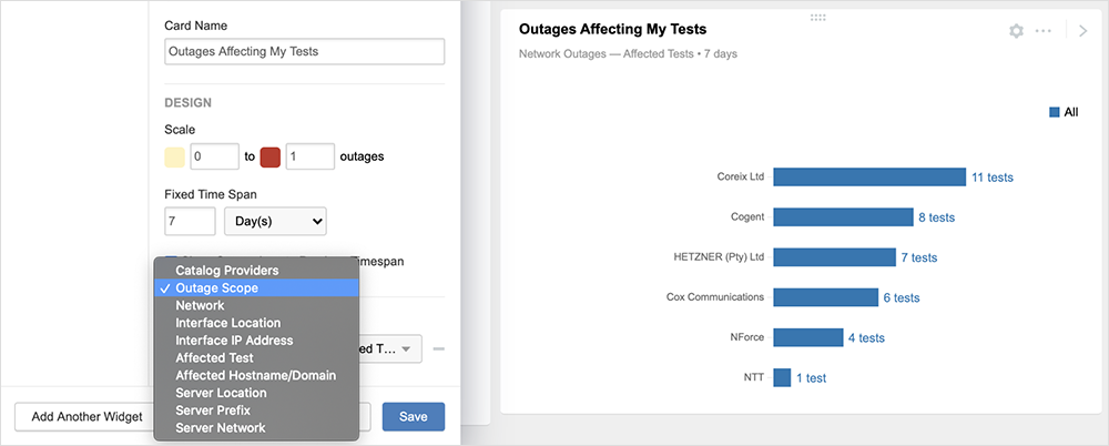 In the example above, we used the “Outage Scope” filter set to a value of “With Affected Tests” to limit the outages listed by the outage metric to only outages impacting one of the customer’s tests. We could then easily see the outages by provider, ranked by the total number of tests affected. But we are just scratching the surface with Outage Scope! We’ve added a number of filter attributes and conditions customers can use to pivot the Network Outages metrics: Catalog Provider, Outage Scope, and Network; Interface Location and Interface IP Address; Affected Test and Affected Domain; and Server Location, Server Prefix, and Server Network. All so you can build the dynamic view you need.