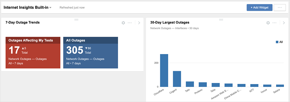 Internet Insights customers can now add widgets to dashboards and reports, leveraging Internet Insights network outage metrics. The Internet Insights data source provides four Network Outages metrics within dashboards and reports (and APIs). This includes Affected Tests (organization test data affected by outages), Interfaces (interface data affected by outages), Locations (location data affected by outages), and, of course, our Outages data.