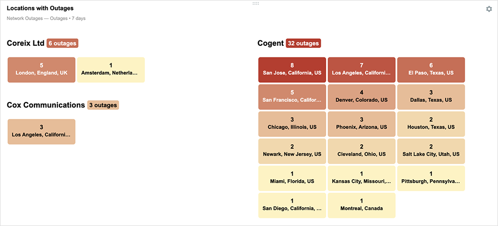 Internet Insights delivers visibility that goes beyond a customer’s own tests and one year of historical outage data. For the first time, customers will be able to leverage that depth of data to create their own views and drive the level of actionable intelligence they derive from Internet Insights for their organization even higher. Beyond test correlation with outages, which highlight internal vs. external disruptions, build your own dashboards with widgets that use network outage metrics to highlight and aggregate events by provider, level of impact, or location. In the example below, the widget has been configured to show locations impacted by provider outages.