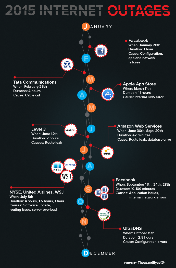 The most impactful Internet outages of 2015 affected entire platforms or ecosystems, setting off a chain of consequences that few would have anticipated. The events ranged from a slew of Facebook outages that affected dependent services to a route leak that took down many sites hosted on AWS. These outages exposed the fact that seemingly unrelated businesses often share common vulnerabilities and services that prove to be critical to their site availability. Shared platforms, hosting services, DNS servers and even physical infrastructure all contribute to the interconnected, collective fragility of the Internet.