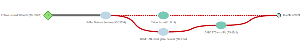 ThousandEyes caught the entirety of the incident caused when JSC RTComm.RU AS 8342 improperly announced the 104.244.42.0/24 IP prefix owned by Twitter. Since JSC RTComm.RU AS 8342 is not the prefix owner, this is a prefix mis-origination, often referred to as a route hijacking—though it is important to note that the term “hijacking” here is a formal designation that does not imply malicious intent, but simply the origination of an unowned prefix without authorization. In Figure 2, we see JSC RTComm announcing Twitter’s prefix to its BGP peer, MTS PJSC AS 8359, which in turn propagated the route to its peers.