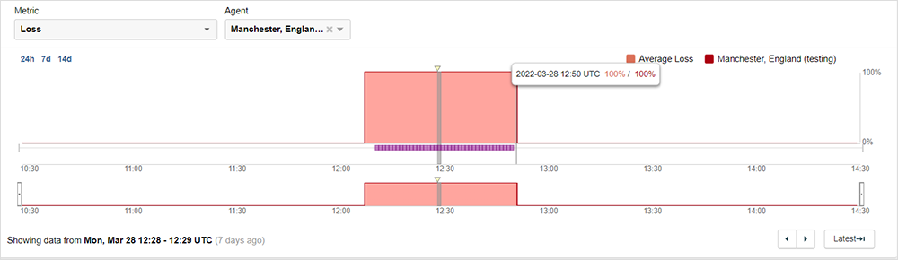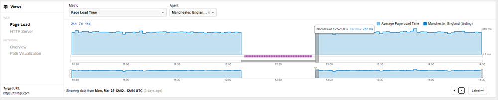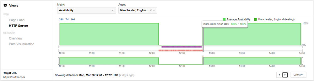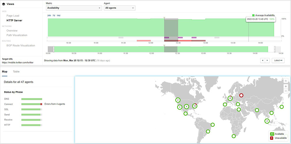 While the global impact of this BGP hijack was limited and most Twitter users outside of Europe experienced no disruption, some users were unable to reach Twitter for nearly 45 minutes until RTComm withdrew the erroneous route. For the impacted users, ThousandEyes monitoring observed timeout failures while attempting to establish a TCP connection to the Twitter service. This resulted in a 100% failure for the impacted users for the full duration of the incident.