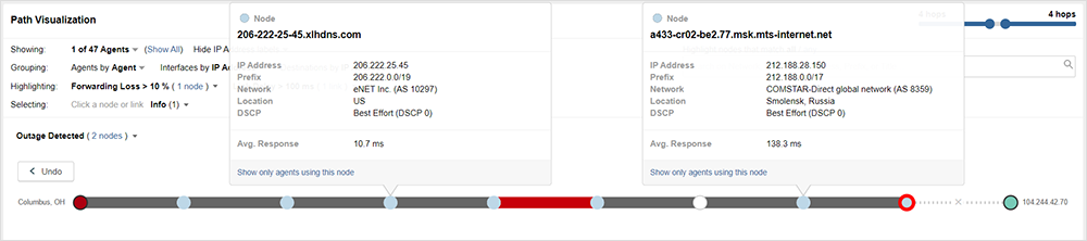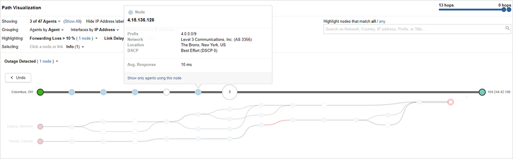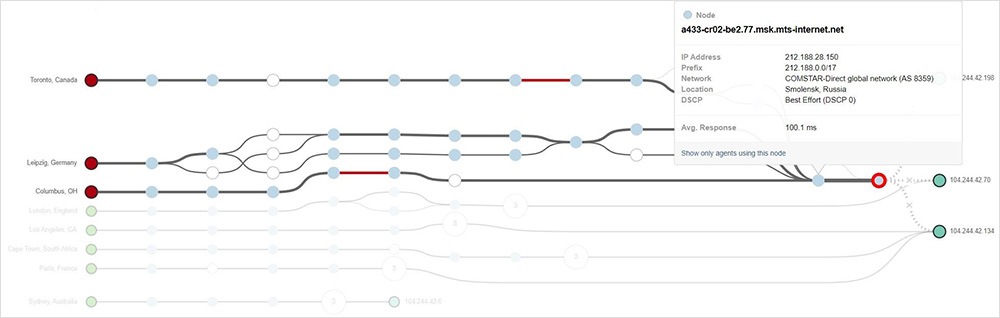 In figure 6, we can see the path changed for Toronto, Canada; Leipzig, Germany; and Columbus, OH; resulting in 100% packet loss after changing to route through MTS PJSC AS 8359 to reach Twitter. Other non-impacted locations continued along successful paths.