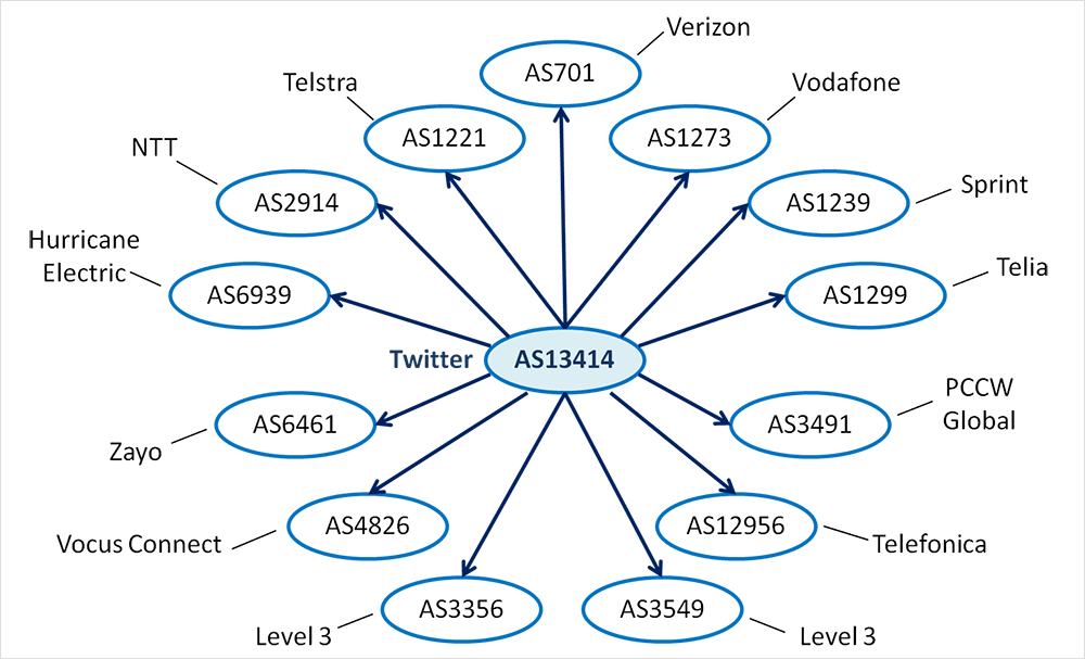 As seen in figure 12, Twitter’s (AS 13414) peers directly with many major ISP and transit providers. This makes for a lot of very short paths to Twitter.