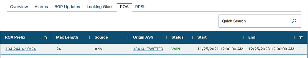 We can see below that Twitter has adopted RPKI and that its 104.244.42.0/24 prefix is digitally signed and ready for RPKI.