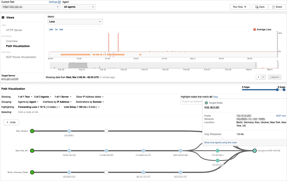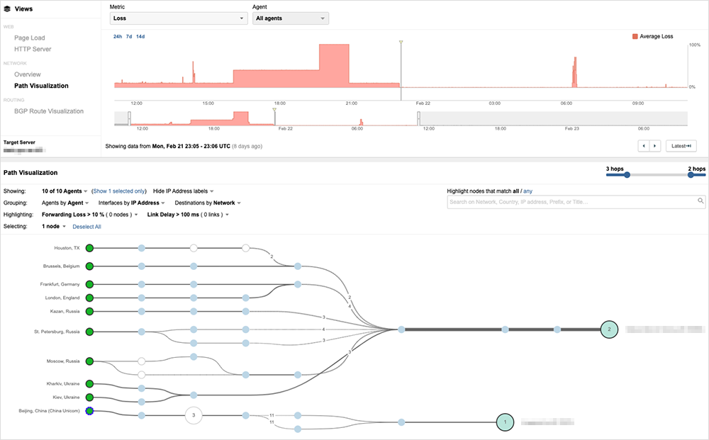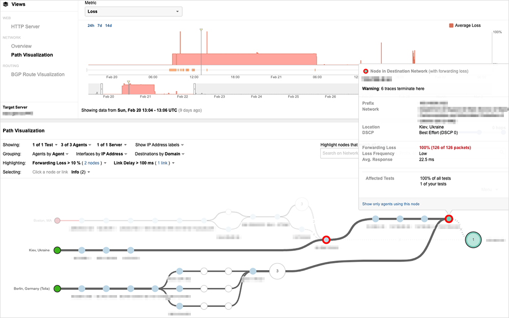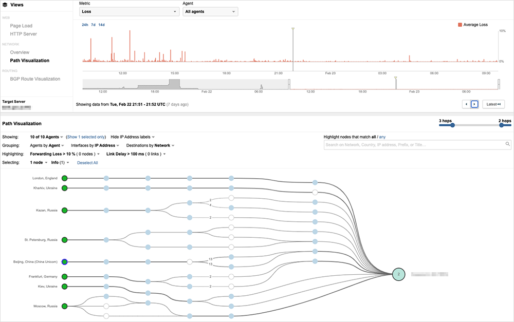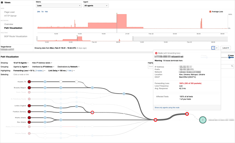 Later, on February 21 around 19:41 UTC, ThousandEyes tests show complete network loss for all traffic destined to the bank, with all loss occurring at another router in the Infocom ISP network. This may indicate a switch to a destination-based blackhole policy via the same ISP.