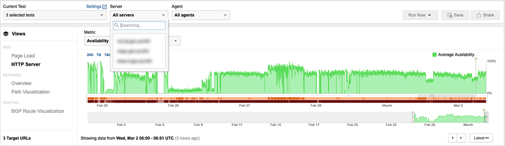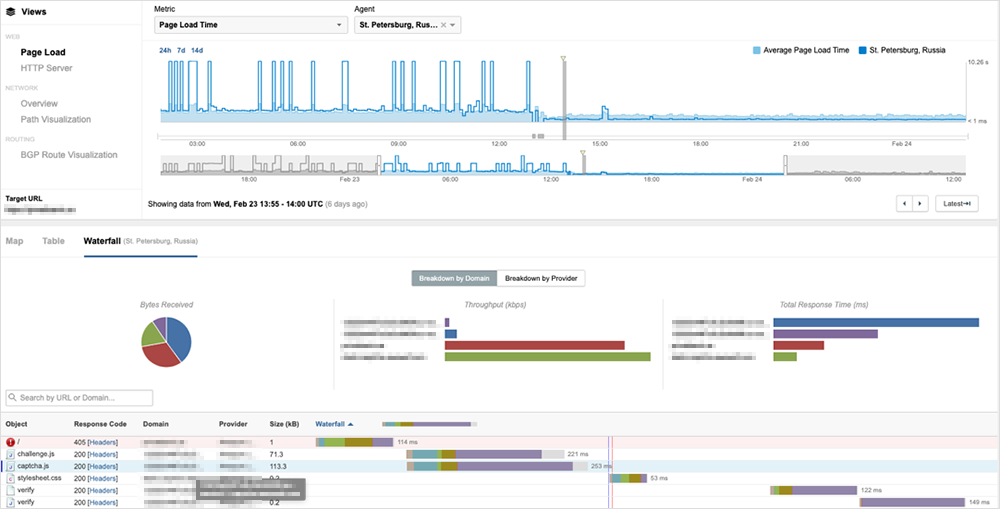 We can see this bank put this policy in place on February 23, 13:00 UTC. ThousandEyes application tests show the website operating normally prior to February 23. Around 13:00 UTC, this website begins implementing application-level security policies. First, traffic from all global locations either times out due to servers not responding, or receives various HTTP errors from their servers, like HTTP 502 Bad Gateway. This is indicative of a cutover to new application services on AWS, which in this case is Amazon’s WAF (web application firewall) service. We can see this from the serving domain in the ThousandEyes web page components view.