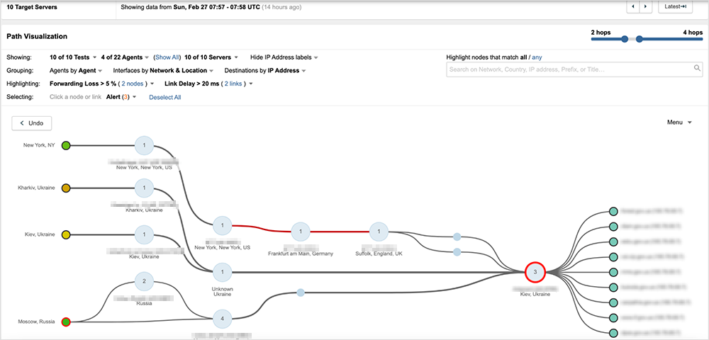 Two service delivery approaches appear to directly correlate with the different levels of availability, with sites fronted by highly scalable cloud services, such as globally distributed CDN and web security services, faring far better than sites that continue to be served solely from local infrastructure. For example, many government sites are hosted in single locations, share common infrastructure with other government sites and connect to users through one or two local Internet service providers. These sites continue to experience significant levels of disruption as shown in Figure 1 where multiple sites belonging to the Ukrainian government are in the same hosting environment and share the same IP address and Figure 2 showing the sustained network degradation.