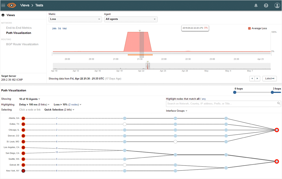 Ivan illustrates this with an example where an Enterprise Agent, dropped into one of the partner sites, was able to accurately point out where in the transit ISP packet drops were occurring and also narrow down the exact timeline of the fault. He says, "We were seeing a 40% loss on average everyday between 5PM to 10PM. Path Visualization immediately pinpointed the issue."