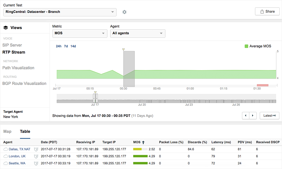 Following a successful beta testing with leading UCaaS providers like Mitel and customers like Box, the new SIP Server and Voice Call tests are now generally available for all ThousandEyes customers. The new additions enhance our voice test capability and provide end-to-end visibility into a VoIP call from SIP signaling to the RTP voice stream. The new Voice tests allow customers to verify functionality and performance of their voice infrastructure, both on their local network and in the cloud.