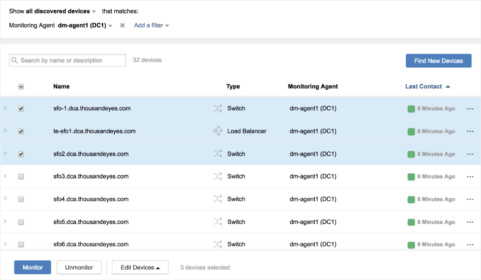 As our customers grow with ThousandEyes, they monitor more of their services and infrastructure. And with more monitoring comes more administration, which no one loves. We want to ease that burden. Over the past few months (and in the next few) you’ll see each of our settings views provide you the ability to filter on the fly and take action with a click.