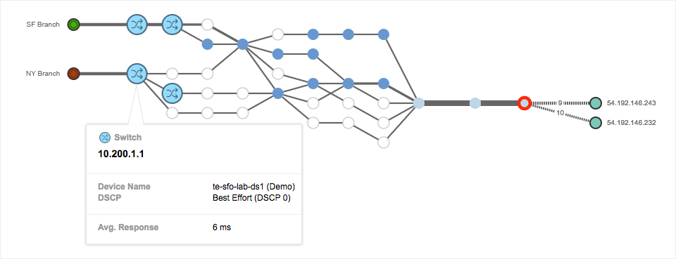 Enterprise Agents collect network device metrics by polling SNMPv2 and SNMPv3 MIBs from network devices (switches, routers, firewalls, load balancers and access points) while simultaneously monitoring application and network performance through active monitoring. Device context is now overlaid with Path Visualization and gives you the flexibility to drill down into detailed device metrics and Layer 2 topology of your internal network.