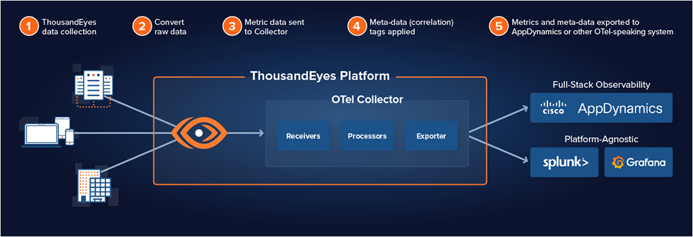 ThousandEyes für OpenTelemetry ermöglicht Datenstandardisierung und -portabilität auf der ThousandEyes Plattform. Es handelt sich um eine Push-API zum Streamen von Netzwerkmetriken im standardisierten OTLP-Format (OpenTelemetry Protocol). Dadurch kann jeder OpenTelemetry (OTel)-konforme Anbieter – einschließlich Cisco AppDynamics, Grafana, Splunk und viele andere —ThousandEyes Metriken nutzen.