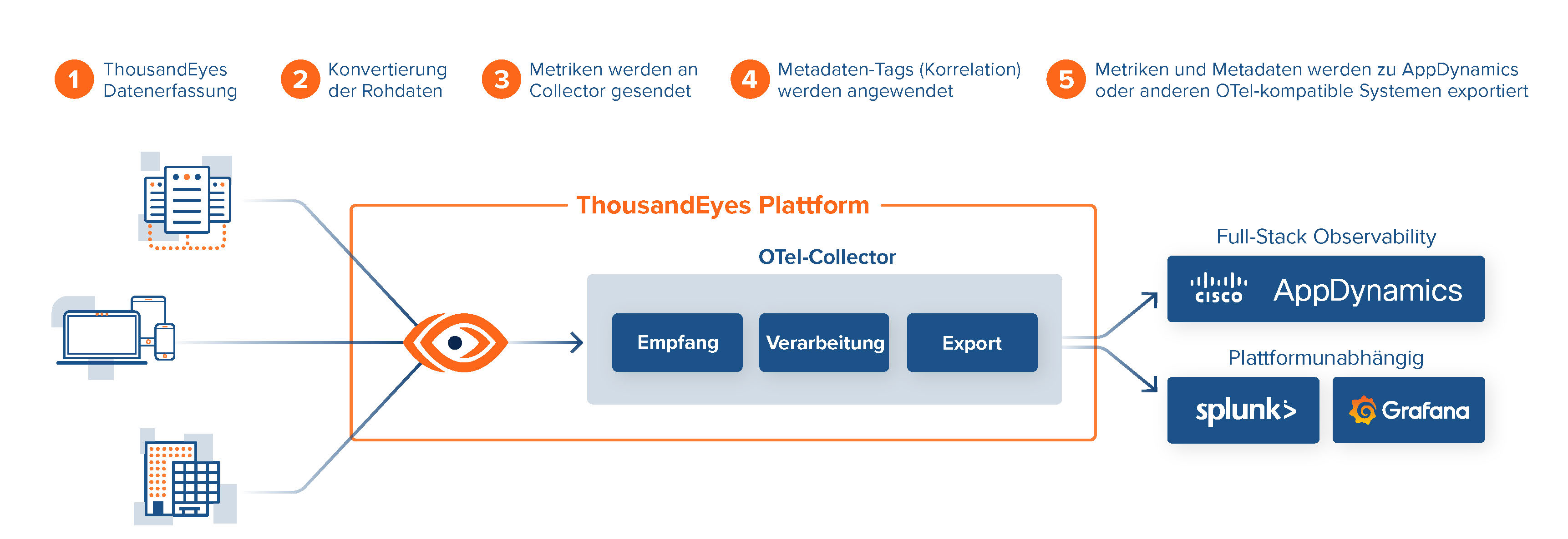 Diagram of the ThousandEyes platform receiving data from multiple sources, processing it, and exporting it to AppDynamics, splunk, and Grafana