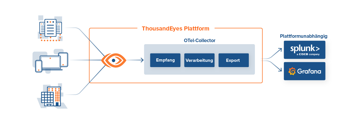 Bei mehreren Lösungen und Plattformen kann es eine echte Herausforderung sein, Daten zu aggregieren und zu korrelieren, um aussagekräftige Einblicke zu gewinnen. Hier kommt ThousandEyes für OpenTelemetry (OTel) ins Spiel. OpenTelemetry ermöglicht die Übertragung von ThousandEyes Metriken an jedes beliebige OTel-kompatible Observability-Tool. Dadurch können Sie Daten über das gesamte Netzwerk, die Geräte und den Applikations-Stack hinweg visualisieren und korrelieren, um aussagekräftige Einblicke zu gewinnen.