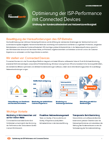 Connected Devices, integrated with the ThousandEyes platform, provides ISPs with an advanced suite of tools for real-time monitoring, advanced performance analytics, and proactive issue resolution. This solution helps enable ISPs to deliver consistent, high-quality service; optimize operational efficiency; and build stronger customer relationships by providing reliable connectivity across all touchpoints.