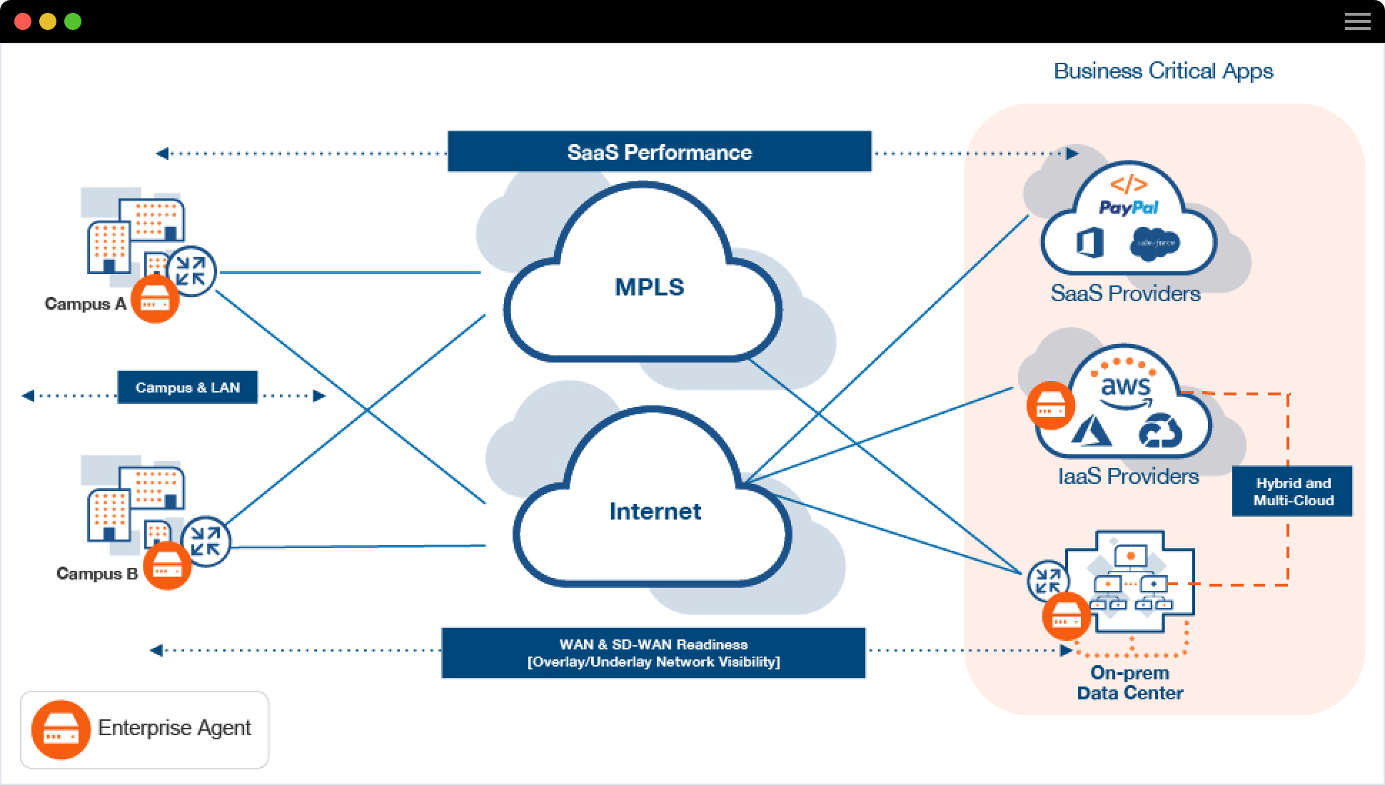 Bei Enterprise Agents handelt es sich um spezielle sogenannte „Software Probes“, die strategisch an wichtigen Punkten in Ihrem Netzwerk eingesetzt werden, z. B. in Rechenzentren, Zweigstellen und virtuellen Umgebungen wie Virtual Private Clouds (VPCs) und virtuellen Netzwerken (VNets). Ihre Hauptfunktion besteht darin, die Performance Ihrer Applikationen zu ermitteln. Dazu setzen sie eine Kombination aus aktiven und passiven Monitoring-Techniken ein. Beim aktiven Monitoring werden Testtransaktionen durch das Netzwerk geleitet, um dessen Performance zu messen, während beim passiven Monitoring der tatsächliche Datenfluss beobachtet wird, ohne ihn zu verändern.