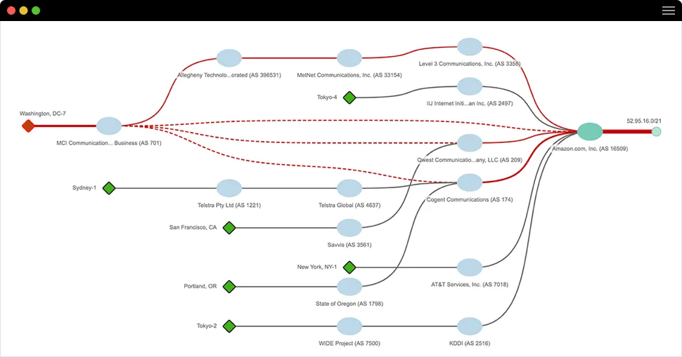 ThousandEyes sorgt für mehr Transparenz im Netzwerk, indem die Lösung BGP-Routing-Daten aus weltweit verteilten Kollektoren erfasst und diese in Form einer konfigurierbaren Ebene nahtlos unter den Service-, Netzwerk- und Pfadvisualisierungsebenen integriert. Wird eine Service-URL für den Test definiert, verfolgen mehrschichtige BGP-Tests automatisch die Erreichbarkeit und Pfadänderungen für alle verbundenen Präfixe. Bei Verwendung einer IP-Adresse als Testziel wird der zugehörige über das Internet geleitete Präfix durchgängig erfasst. Möglich ist zudem die Einrichtung von BGP-Monitoring für ein spezifisches Präfix. Dadurch erhalten Sie Warnmeldungen zu verdächtigen Aktivitäten, die auf Hijacks oder Leaks hindeuten könnten, um Netzwerksicherheit und -performance umfassend zu gewährleisten.