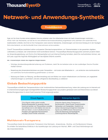 ThousandEyes Network & Application Synthetics bietet End-to-End-Transparenz über Ihr gesamtes digitales Ecosystem hinweg – von Ihrem WAN bis hin zu allen Applikationen und Usern. In der vernetzten Welt von heute ist dies ein echter Pluspunkt. Synthetische Tests werden durch Real User Monitoring nicht beeinträchtigt und bieten kontinuierliche Netzwerkverbindungen, Latenz und Seitenaufbaumetriken in Echtzeit, um die Einhaltung Ihrer Service Level Agreements (SLAs) sicherzustellen.
