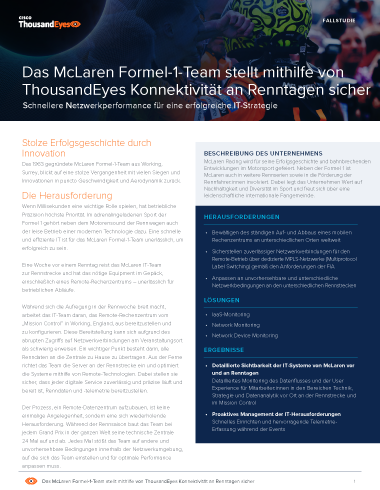 Für das McLaren Formel-1-Team machen Millisekunden den entscheidenden Unterschied zwischen Siegerpodest oder dem letzten Platz. Daher hat das McLaren IT-Team entschieden, dass dieselbe Präzision für ihre Technologie erforderlich ist. Um IT-Probleme zu vermeiden, die den Betrieb während wichtiger Zeiträume wie z. B. Grand Prix-Events beeinträchtigen, hat das Team vor dem Grand Prix in Montreal 2023 ThousandEyes, insbesondere Enterprise Agents, in ihrem Rechenzentrum implementiert, das mit dem Mission Control verbunden ist. Mit dieser Lösung konnte das Team die Performance des Netzwerks proaktiv und optimal tunen. Der Einrichtungsprozess erwies sich als schnell und effizient und dauerte nur einige Stunden. Die Ergebnisse waren sofort spürbar.