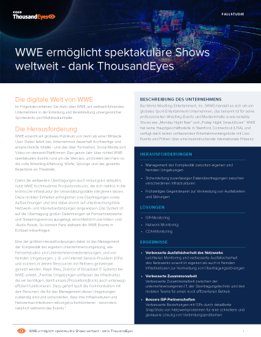 Dank ThousandEyes kann WWE Netzwerkanomalien frühzeitig erkennen, die durchschnittliche Zeit bis zur Problembehebung (Mean Time to Resolution/MTTR) verkürzen und die Auswirkungen von Ausfällen auf das Unternehmen effizient abmildern. Darüber hinaus verkürzt die ThousandEyes Plattform nicht nur die MTTR, sondern ermöglicht auch umfassendere Einblicke und bessere Zusammenarbeit. So kann WWE seine Netzwerkinfrastruktur stetig optimieren und gleichzeitig die Bereitstellung hochwertiger Inhalte für ein globales Publikum sicherstellen.
