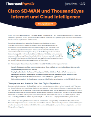 ThousandEyes Internet und Cloud Intelligence bietet End-to-End-Transparenz vom WAN Edge bis hin zu allen geschäftskritischen Punkten, sodass Sie eine optimale Digital Experience bieten können − für alle User, Applikationen und Netzwerke. ThousandEyes Enterprise Agents sind jetzt nativ in Cisco SD-WAN-Routingplattformen integriert. So erhalten Sie schnell Hop-by-Hop-Einblicke in den Netzwerk-Underlay einschließlich detaillierter Pfad- und Performancemetriken und können die Overlay- und SaaS-App-Performance messen und proaktiv überwachen.