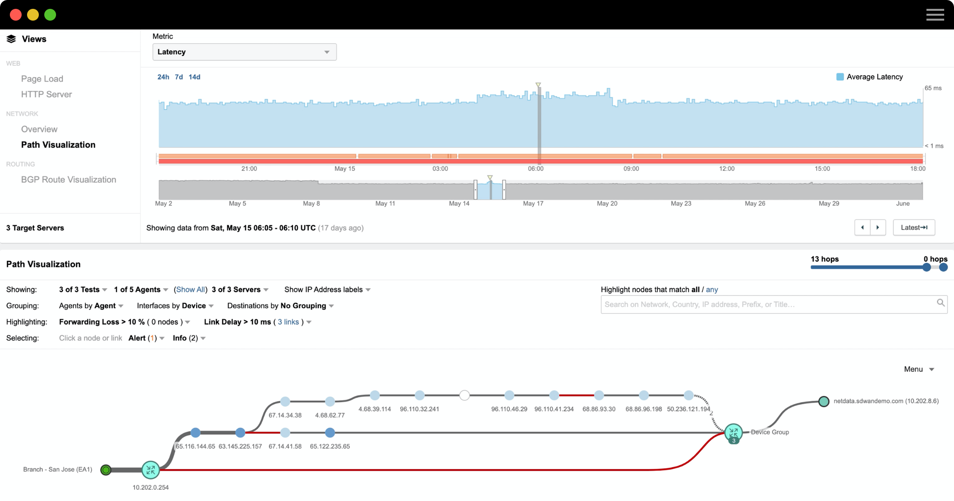 Sorgen Sie für die Erreichbarkeit und Verfügbarkeit von geschäftskritischen SaaS-Applikationen, intern gehosteten Apps und Cloud-basierten Services in allen Netzwerken, einschließlich des Internets und des Unternehmensnetzwerks. ThousandEyes bietet umfassende Sichtbarkeit von Hop-by-Hop-Netzwerkpfaden über ISPs und Cloud-Netzwerke hinweg und sorgt so für die Integrität des externen Border Gateway Protocol (eBGB) Routing. Mit proaktivem Benchmarking und kontinuierlichem detaillierten Monitoring von kritischen Service-Providern stellen Sie sicher, dass trotz kleinster Unterbrechungen vorab vereinbarte Operation Level Agreements (OLAs) und Service Level Agreements (SLAs) eingehalten werden.