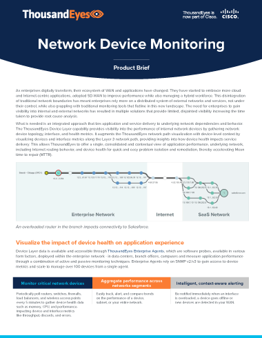 Durch die Verlagerung Ihrer Applikationen in die Cloud ist die User Experience zunehmend vom Internet abhängig. Doch herkömmliche Monitoring-Tools sind oft isoliert und zeigen nur einen kleinen Ausschnitt des Gesamtzustands. ThousandEyes integriert Network Device Monitoring mit der Visualisierung des Gerätezustands, der End-to-End-Netzwerkpfade und der Performance Ihrer intern gehosteten und Cloud-Applikationen an einem zentralen Ort. Durch das Monitoring des Zustands von WAN-Netzwerkgeräten, wie z. B. Wireless Access Points, Router, Switches, Firewalls und Load Balancer, kann das IT-Team Probleme mit Netzwerkgeräten schnell analysieren, einschließlich überlasteter oder fehlerhafter Schnittstellen, die möglicherweise die Performance von SaaS-Applikationen wie Microsoft 365 beeinträchtigen. Durch die Visualisierung der Netzwerktopologie Ihrer Netzwerkgeräte in ThousandEyes können Probleme mit Geräteschnittstellen in Sekundenschnelle zurückverfolgt werden. Infolgedessen kann Geräteverhalten mit negativen Auswirkungen auf Applikationen eliminiert werden.