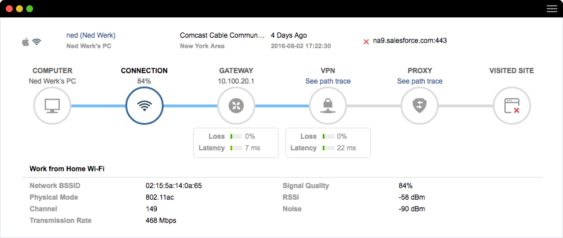 Isolieren Sie Ursachen – von lokalen DNS-Datensätzen über lückenhafte Wireless-Abdeckung bis hin zu Transit-ISP-Fehlern. Dabei können Sie jedes Büro bzw. jeden Standort, an dem Ihr Team Salesforce verwendet, einbeziehen.